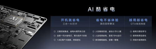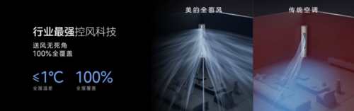 美的全面风空调拥有行业最大的“全面屏”风口,出风口面积为传统柜机的2.34倍,为用户带来“处处有风 处处舒适”体验的同时,消除了全屋送风死角;美的无风感空调针对“冷风直吹”的行业痛点,依托“AI无风感”技术,让风自动感知人,并根据用户对风感的需求,主动开启左无风感、右无风感或全无风感模式,充分满足了母婴、老人、小孩、亚健康白领等特殊人群吹空调的需求;美的酷省电Ultra系列及酷省电客厅中央空调等产品,则搭载了美的空调独创的AI酷省电算法,在不牺牲冷量的前提下,确保空调开机就省电、越用越省电,让空调摆脱了“电老虎”的称号。