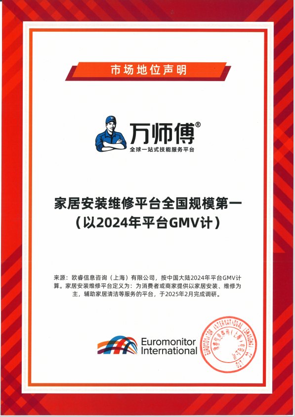 2025年初,国际权威机构欧睿信息咨询发布声明称,按2024年平台GMV计算,万师傅以显著优势成为全国规模第一的家居安装维修平台。这一认证背后,折射出中国家居服务市场从分散到集约的深刻变革。