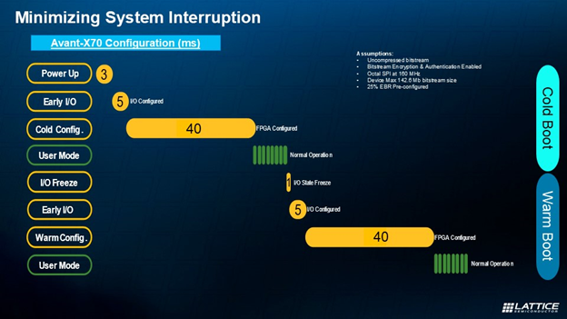 ● 早期I/O启用功能:Avant FPGA实现快速启动的核心要素之一是其独特的早期I/O启用技术。该创新方案允许器件左右两侧的特定I/O组在位流处理初始阶段即激活并进入用户预设的驱动状态。通过这种方式,关键系统接口能够在配置周期极早期完成初始化并投入运作,从而为整个系统实现“瞬时启动”的响应能力。与传统方案需要等待完整位流加载不同,采用该技术的系统可在5毫秒内实现与FPGA I/O端口的交互,大幅缩短了系统启动时间。