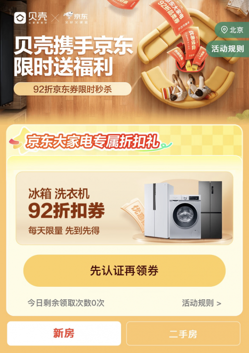 近日,京东家电家居携手贝壳“金五购房节”一起送福利,为消费者提供“购房+家电”一站式安家优惠解决方案。活动期间,消费者在贝壳平台购买新房,不仅可以享受贝壳提供的2500元新房成交补贴,还可在4月28日24点前,在贝壳APP和京东APP领取京东提供的92折专属优惠券。