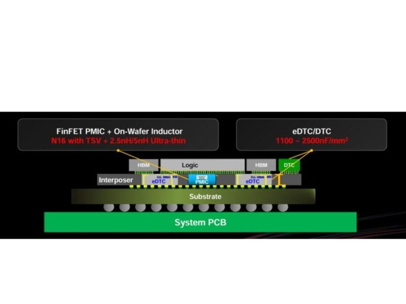 该 PMIC 将具有陶瓷层来构建电感器,PMIC 将位于衬底上,与使用 TSMC CoWoS-L 工艺构建的中介层中的嵌入式深沟槽电容器 (eDTC) 一起。