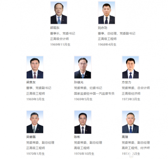 截至目前,一汽集团领导班子共有八位,分别是董事长邱现东、总经理刘亦功、党委副书记梁贵友、纪委书记孙继光、总会计师方世力以及副总经理吴碧磊、陈彬、高璞。