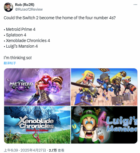 有游戏爱好者指出,新一代Switch可能是任天堂迈向“第四代”作品的重要转折点。在此期间,多个系列有望迎来各自的第四部正统作品。例如,银河战士Prime 4:超越、喷射战士4、异度之刃4以及路易吉鬼屋4等都被视为可能推出的作品。