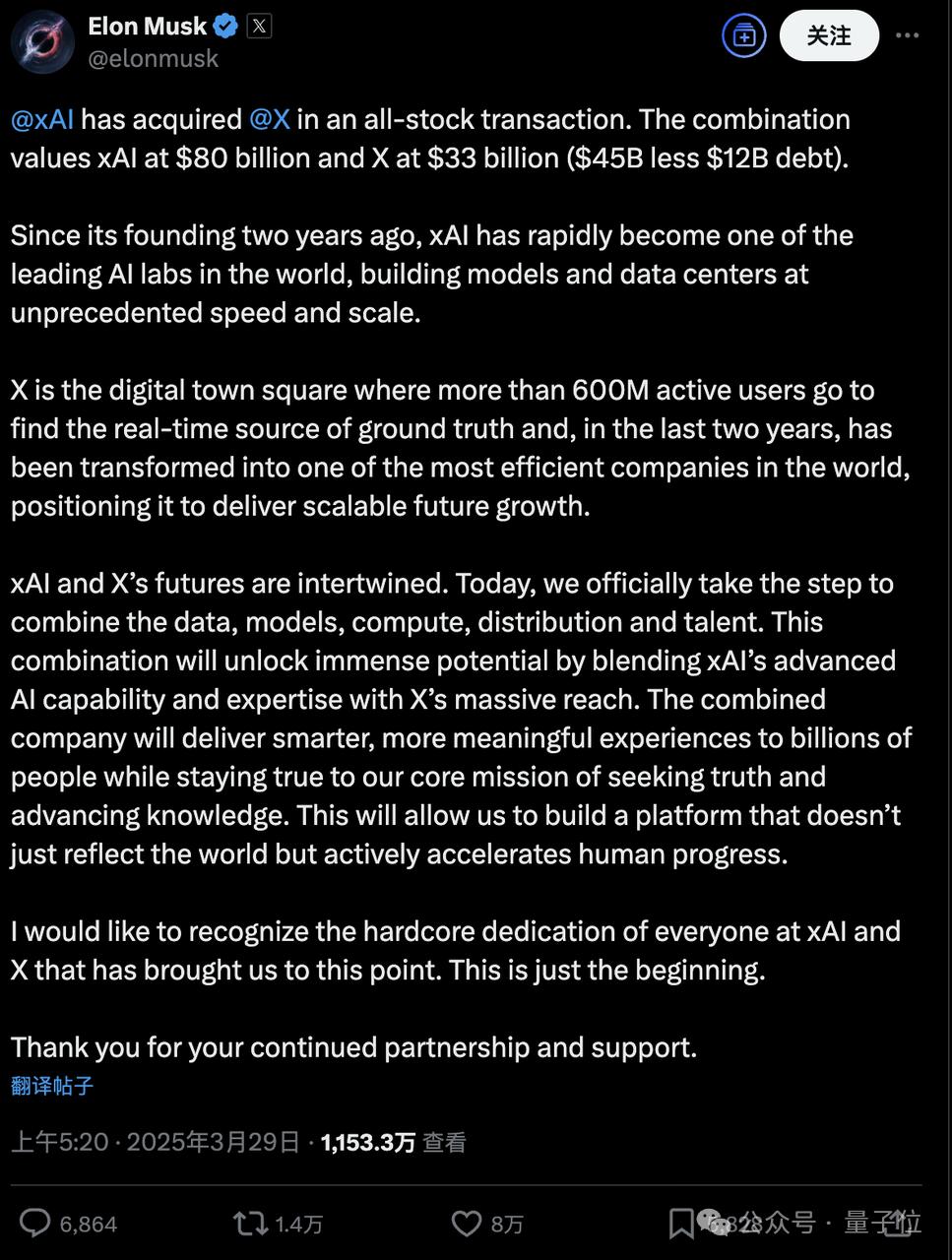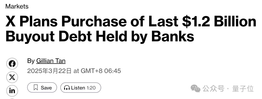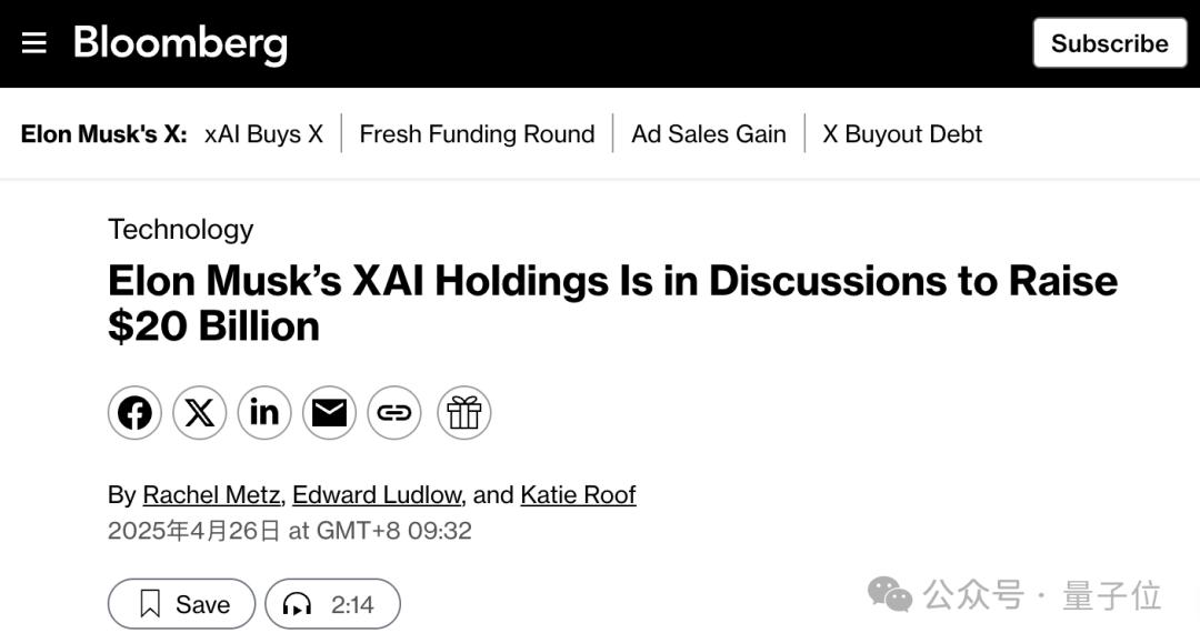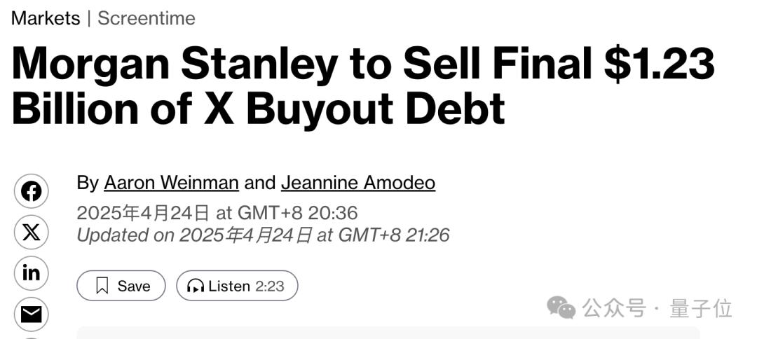 马斯克xAI与X合并后,又有新动向!彭博社消息,马斯克正在为合并后的XAI Holding寻求一笔200亿美元(约1450亿人民币)的融资。如果交易完成,新·XAI的估值将超过1200亿美元(约8745亿人民币)。届时,这笔交易也将成为继OpenAI(400亿美元)之后史上第二大初创企业单轮融资。马斯克筹钱还债按照彭博社的说法,马斯克这次寻求融资的目的可能是为了偿还债务。并且还透露,这笔债务源于2022年的Twitter私有化,当时马斯克花了440亿美元将其收购,后来改名为现在的X。上个月,有消息称X计划偿还银行持有的最后12亿美元与收购Twitter相关的银行债务。这笔债务的债权人是摩根士丹利,最新消息是本周四(24日)摩根士丹利计划将其出售。摩根士丹利主导的这次债权出售,其实是在推动一项再融资。X公司此前从摩根士丹利获得的贷款,利率为14%,这次摩根士丹利获推出了一笔9.5%利率的固定利率新贷款,用于让X偿还高息的旧债务。而新贷款的债权,摩根士丹利计划以面值的97.5%-98%的折价价格卖出。知情人士估计,此举可以帮助X公司减少4300万美元的年度利息支出。今年2月,摩根士丹利还和其他六家银行,共计出售了47.4亿美元与X相关的债权。实际上,收购带来的的债务一直是马斯克所面临的一大负担。上个月,X支付了2亿美元的“债务偿还成本”;去年,X仅是偿还利息就还了13亿美元。自合并以来,马斯克也一直在试探投资者,了解他们是否愿意向合并后的公司投入更多资金。目前,本轮最终融资金额仍未确定,但不排除超过200亿美元的可能。X收入模式向AI+订阅转型上个月,两家公司以xAI收购X的方式完成合并,这笔收购通过全股票交易进行。此次交易中xAI的估值为800亿美元,对X的估值则为330亿美元。两者合二为一,成为XAI Holding之后,数据、模型、算力和人才等都将整合。但其实在合并之前,两家就已经深度融合——截止到1月份,X还持有xAI价值60亿美元的股份。两家公司还有许多共同投资者,包括Andreessen Horowitz和红杉资本等,交易后X投资者也将获得对应的xAI股权。产品层面,xAI的Grok大模型已经深入整合到X平台中,可以帮助用户基于推文“一键吃瓜”;从另一边来看,拥有来自于X的训练数据也是Grok的一大亮点。甚至,xAI和两家公司此前已在旧金山湾区共享办公室。收购合并的背后,是X正在从一个由主流广告商支持的社交媒体平台,转变为一个押注人工智能和订阅收入的平台,这一变化似乎提振了其收入。该平台2月份与数据许可和订阅相关的收入为9100万美元,同比增长30%,广告收入也有所增长,但增幅仅为4%。这与马斯克收购X(当时为Twitter)时的情况形成了鲜明对比,当时该平台严重依赖传统蓝筹公司的广告。而这次X与xAI的合并,也进一步重塑了公司的业务重点。参考链接:[1]https://www.bloomberg.com/news/articles/2025-04-26/elon-musk-s-xai-holdings-is-in-discussions-to-raise-20-billion[2]https://www.bloomberg.com/news/articles/2025-04-24/morgan-stanley-to-sell-final-1-23-billion-x-debt-held-on-books