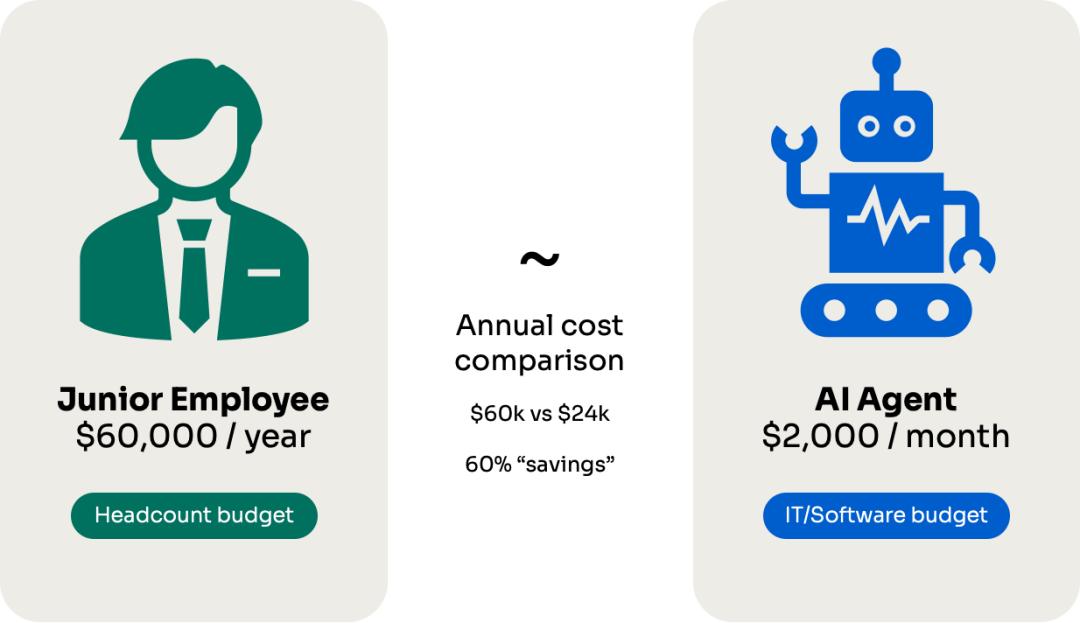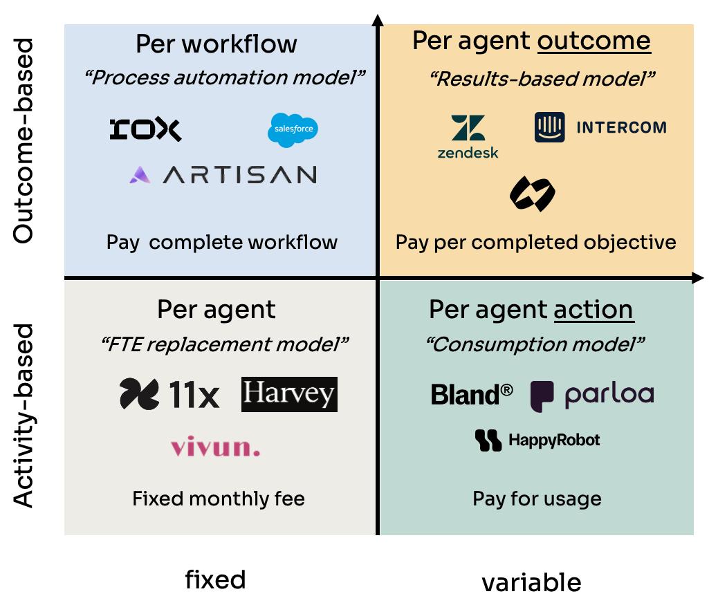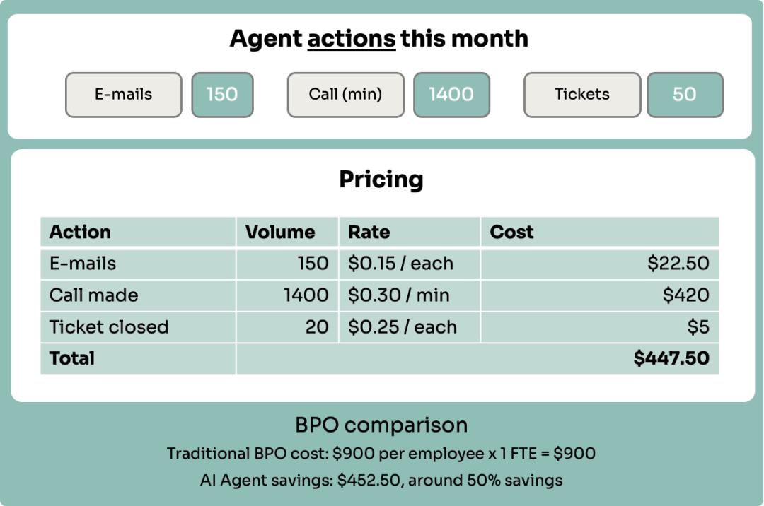 01 AI代理的四种定价模式许多公司只使用这四种模式中的一种,但也存在一些混合模式(例如,按座位定价和按座席定价相结合)。模型1:按席位定价11x、Harvey和Vivun等公司率先采用了这种方法,有效地将其AI代理定位为数字员工。这个模式下,每个代理都被视作初级员工或者部分全职员工的替代者;这意味着,支出应该来自员工预算,而不是IT或软件工具预算。主要包括三个特点:1) 部署每个代理的固定月费2) 价值标准与员工支出直接相关3)成本可预测,类似于传统平台或基于座位的SaaS定价提示:当您的座席能够执行一系列原本需要额外招聘员工的综合任务时,这种模式尤其有效。当您能够证明月薪2000美元的AI代理能够取代年薪60000美元的初级员工时,客户会更容易理解AI代理的价值。此模式通常与按席位、按项目或其他基于使用情况的指标合并,形成混合模式。像Salesforce 和HubSpot这样的公司都会按传统用户席位收费,并额外收取代理功能费用。像ServiceNow这样的公司,也会在其分级席位定价的高端版本,加入代理功能。最适合这种定价方式的AI企业:AI代理负责处理广泛职责或完整工作职能,且工作量稳定且可预测。同时,又能够清晰地阐明接管该职能后可以节省的成本。优点:预算来自员工支出,而非技术工具支出,潜在付费能力更强。缺点:竞争差异化程度低。这种定价策略很容易让企业陷入价格战。模式2:按代理行为定价Bland、Parloa和HappyRobot等公司都采用了这种方法,它与云基础设施、业务流程外包 (BPO)和其他类型的呼叫中心的基于使用量的定价方式类似。每当客服人员执行一项独立操作时,客户就需要为这次服务付费。这种付费方式有三个特点:1) 通常表现为象征性消费,并附加保证金;2) 有时表现为按分钟定价;3) 使用量和成本之间的直接关系;提示:此模式提供透明度,并将成本与实际使用情况挂钩。客户只需按实际使用量付费,这对于工作流程相对复杂或正在尝试AI的组织而言极具吸引力。最适合这种定价方式的AI企业:执行频率或数量不可预测,且擅长完成多个离散任务的代理。优势:与其他自由职业机构相比,业务流程外包的预算更容易获得,因为后者提供更优厚的服务、更完善的服务等级协议(SLA)且成本更低。一些大型企业的BPO支出将达到1528亿美元,相当于每位员工877美元。缺点:竞争差异化程度最低。按活动定价本质上让你变成了一种商品,而且价格会下降。模式3:按代理工作流程定价Rox、Salesforce和Artisan等公司已经实施了这种模式,对提供特定结果的理操作的完整序列收费。这种付费方式有三个特点:1) 根据已完成的工作流程而非单个操作进行定价;2) 每个工作流程代表一系列相关且有用的任务(例如,进行研究、撰写和发送电子邮件或处理对话);3) 价值与流程自动化相关,而不仅仅是任务执行;提示:这种方法在基于消费和基于结果的定价之间取得了平衡,使其成为复杂但标准化流程的理想选择。最适合的AI企业:执行多步骤流程并具有明确中间交付成果的代理。优点:如果工作流程标准化,则易于实施,并且企业可以轻松衡量使用AI而非人工操作的成本节省。复杂的工作流程更难定价,但它们能为企业带来更牢固的护城河。缺点:如果工作流程是标准的,例如客户研究或电子邮件撰写,这种定价方式会让企业面临价格下降的风险。如果工作流程很复杂,定价就会很困难,企业可能会因为运行时间较长,工作流程无法产生收入而出现亏损,比如解析一组冗长复杂的文档(例如Icertis )或执行安全扫描(例如XBOW )。模式4:按代理的结果定价Zendesk、Intercom、Airhelp和Chargeflow (前面介绍过)等公司率先采用了这种方法,将定价直接与完成的目标挂钩。这种付费方式有三个特点:1)根据已完成的工作或取得的成果收费;2)可以是标准化结果(Intercom)或根据客户定制(Sierra);3)将价格与交付的业务价值直接挂钩;提示:此模式为客户提供了最清晰的价值主张,因为他们只有在获得切实成果后才会付费。然而,AI企业需要保证AI代理能够持续交付结果。最适合的AI企业:在相对成熟的场景,具有可预测性能和明确定义的成功指标的AI应用。优点:产品与客户需求高度契合,被竞争对手取代的风险最低,也会避免因市场竞争导致的价格下降。缺点:结果需要高度定制,这可能导致定制项目的合同激增。同时,结果也可能受归因影响,例如AI SDR。如果没有办法证明AI代理所产生的结果,这就不是一个好的定价方式。02 定价模式的优化建议随着大模型成本下降,AI代理将会出现新的定价模式,这会对传统的定价模式造成巨大压力。1)按座席定价我们相信这种模式可能会持续一段时间,但为了面向未来,建议您:1)将价值主张从“比人类便宜”转变为“比人类更有能力”;2)将更多功能加入到固定价格的套餐里;3)创建具有明确能力差异的分层代理级别;2)按代理行为定价我们认为这种模式不会经受住时间的考验。因为这种定价模式很容易受到技术成本下降以及价格战的影响。1)快速过渡到工作流程或基于结果的模型;2)添加商品产品中不具备的专有功能;3)专注于你的专业知识可以获得溢价的专业领域;3)按代理工作流程定价这个定价方式非常稳健,但仍然有一些可以优化的地方:1)专注于复杂、多步骤的工作流程,并提供清晰的投资回报率 (ROI);3)开发抵制商品化的专有工作流组件;3)将分析和优化等业务关键部分捆绑