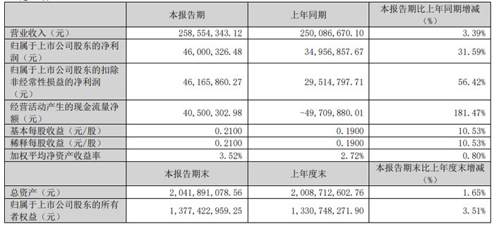 报告期内,经营活动产生的现金流量净额为40,500,302.98元,同比增长181.47%;报告期内,基本每股收益为0.21元,加权平均净资产收益率为3.52%。