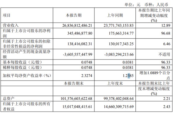 报告期内,经营活动产生的现金流量净额-3,605,557,447.99元;基本每股收益为0.0748元/股,较上年同期的0.0381元/股增长96.33%;加权平均净资产收益率2.3274%。
