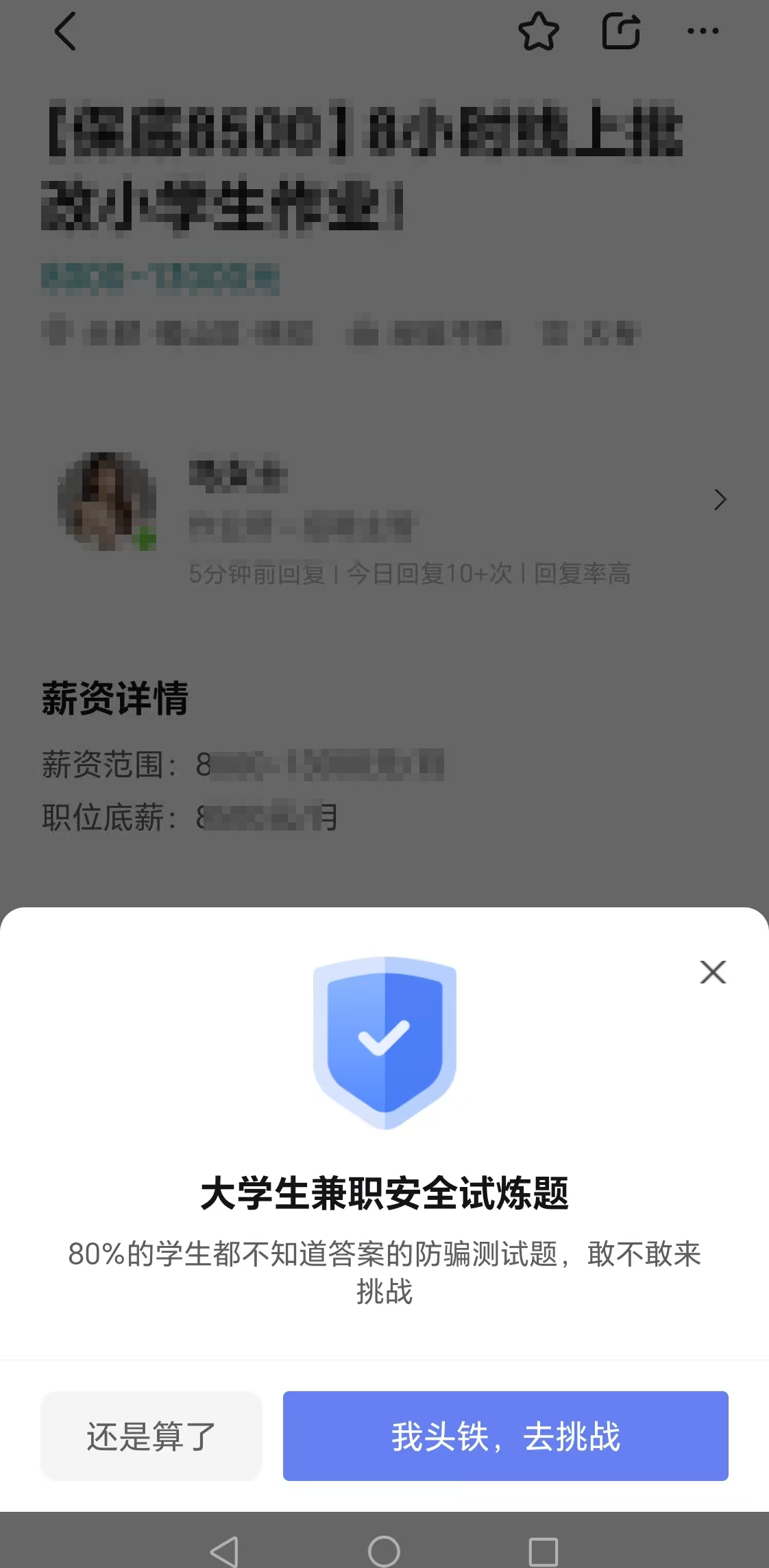 “五一”小长假将至,在北京读大三的小何早早制订了一个完美的假期计划——找份兼职干几天,小赚一笔零花钱,同时积累些社会实践经验。打开BOSS直聘查看兼职岗位,还没跟招聘者开聊,小何发现手机上先弹出一套《大学生兼职安全试炼题》,题目从付费内推到刷单返利、借号投票等,涵盖了多种兼职诈骗套路。