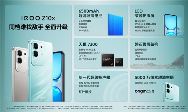 其他方面,iQOO Z10x还支持红外遥控、400%立体声双扬声器、Wi-Fi 6、蓝牙5.4、侧边指纹识别等。