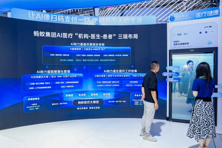 在蚂蚁集团展区,首先映入眼帘的是蚂蚁集团医疗AI产业布局图,展示了蚂蚁用AI帮助普通人看病的技术探索和应用实践。