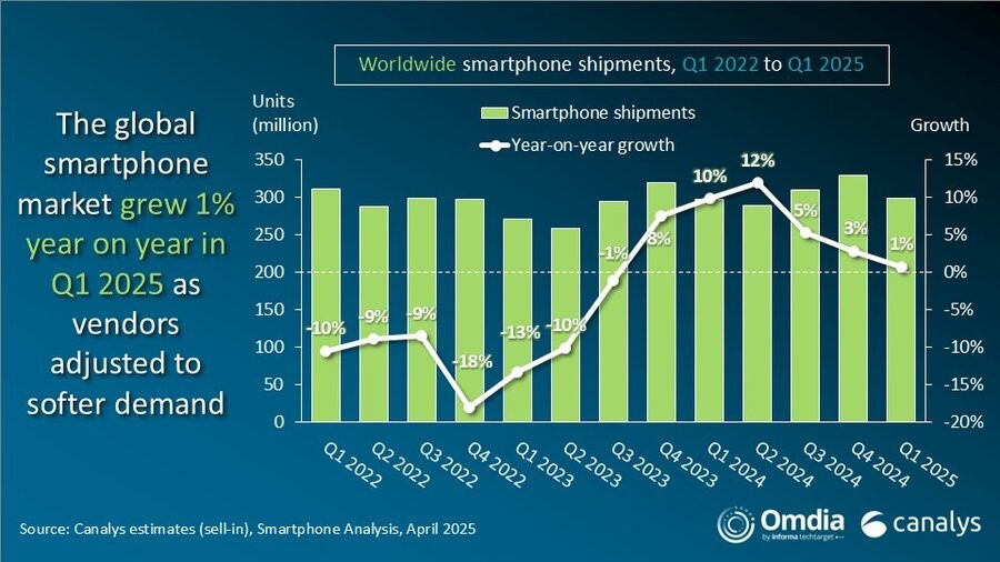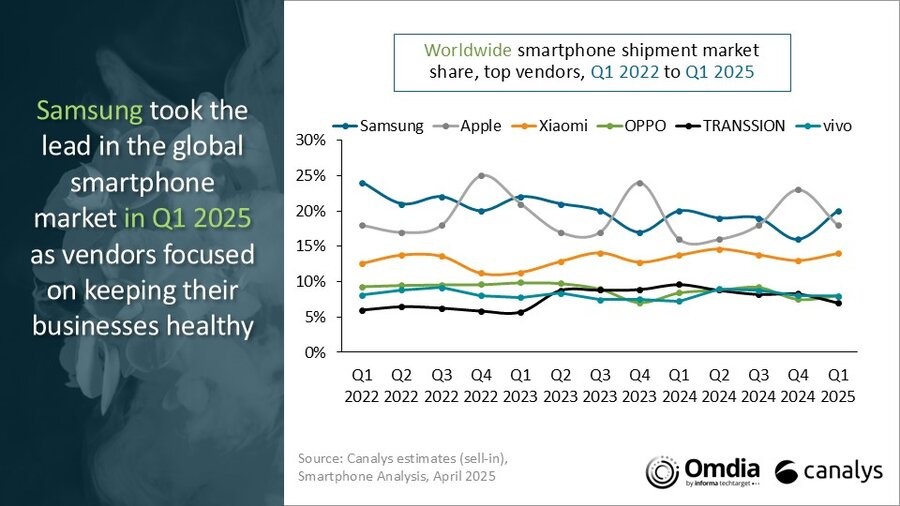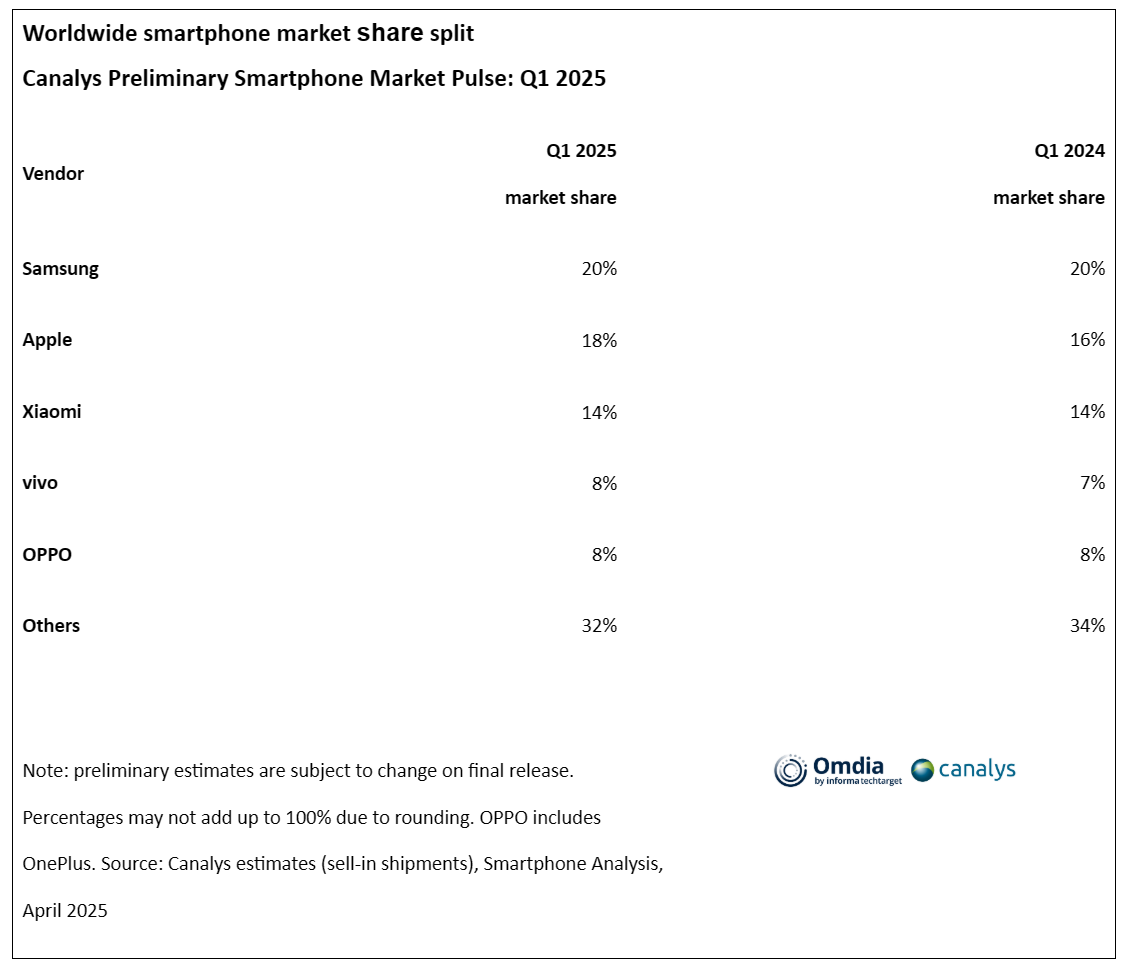 根据Canalys的最新研究,2025年第一季度全球智能手机市场同比增长1%。在持续的宏观经济逆风、消费者谨慎情绪和渠道库存消化延迟的背景下,市场仅实现小幅增长。三星以20%的市场份额领跑全球;苹果紧随其后,市场份额18%。小米以14%的份额位列第三,与一年前持平,而vivo和OPPO分别以8%的市场份额排名第四和第五。