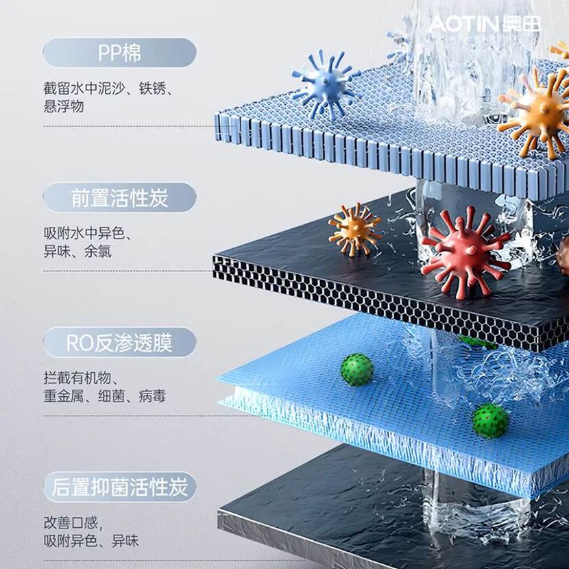 PP棉、前置活性炭、RO反渗透膜