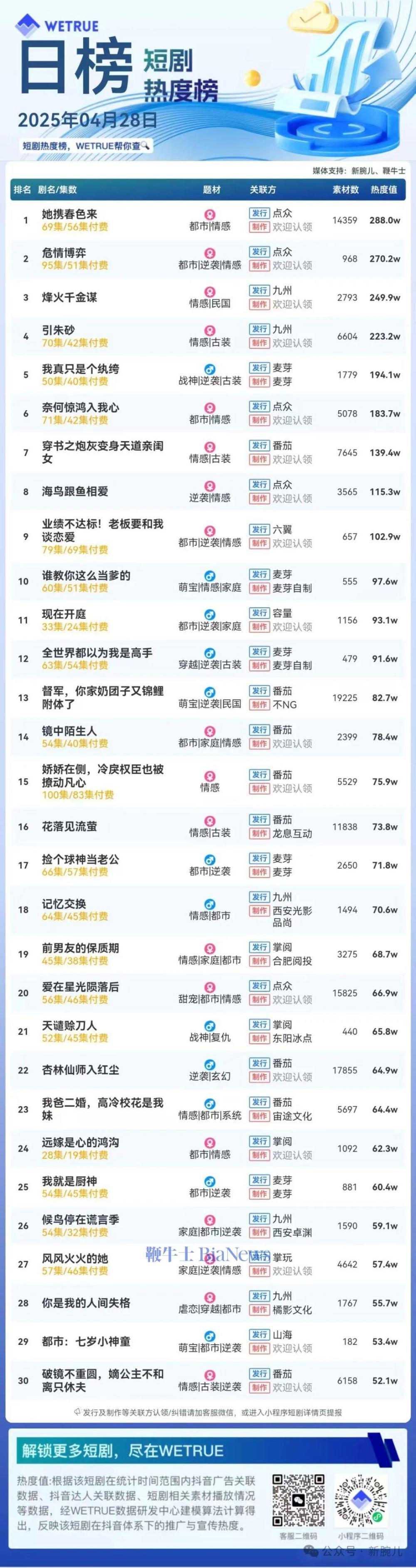 1、本日榜为WETRUE短剧数据公司提供,新腕儿和鞭牛士提供联合支持。