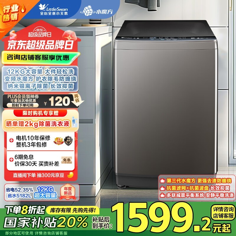 小天鹅TB120V81DT波轮洗衣机,原价1244元现1168元