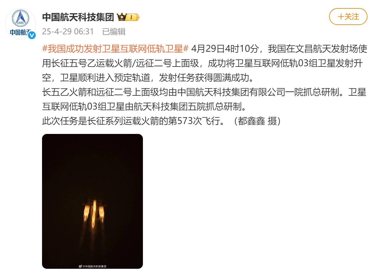 C114讯 4月29日消息(颜翊)北京时间2025年4月29日4时10分,我国在文昌航天发射场使用长征五号乙运载火箭/远征二号上面级,成功将卫星互联网低轨03组卫星发射升空,卫星顺利进入预定轨道,发射任务获得圆满成功。