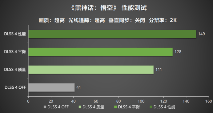 在2K分辨率测试中,耕升GeForceRTX 5060 Ti 16GB 追风OC显卡在关闭DLSS4模式时,表现出的平均帧数为41帧。而在开启NVIDIA DLSS 4技术时,《黑神话:悟空》在DLSS4质量模式和平衡模式下,分别达到111帧和128帧的平均帧数表现。而性能模式更是实现了149帧的流畅体验,其帧数有着近263%的提升,进一步展现了DLSS4技术的强大实力。这样的性能表现不仅能够满足玩家在高画质下的需求,更能为追求流畅度的玩家提供出色的游戏体验。