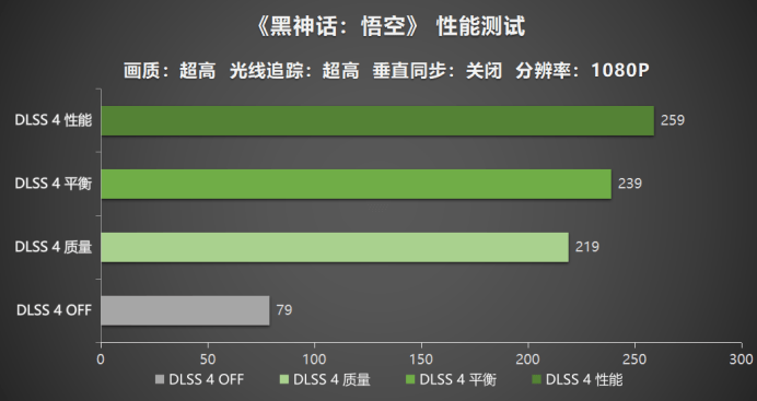 在1080P分辨率的测试中,耕升GeForce RTX 5060 Ti 16GB 追风OC显卡在关闭NVIDIA DLSS 4技术时,平均帧数为79帧。而在开启NVIDIA DLSS 4技术时,游戏在DLSS4性能模式下可以达到平均259帧的成绩,其性能获得大幅提升。此外,如果玩家更注重画质与帧数的平衡,可选择启用DLSS4平衡模式,依旧可以达到平均239帧的优异成绩。由此可见NVIDIA DLSS 4技术能够为游戏带来大幅的提升。