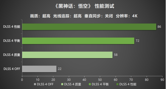 最后进行的是4K分辨率的测试,从图中数据可以看到,由于分辨率的提升,导致游戏对显卡的性能需求也有所增加。耕升GeForceRTX 5060 Ti 16GB 追风OC显卡在关闭NVIDIA DLSS 4技术时,平均帧数仅为22帧。开启NVIDIA DLSS 4技术后,游戏在DLSS4平衡模式和性能模式下,平均帧数分别为72帧和86帧,拥有显著的性能提升,对于追求极致的4K分辨率和流畅体验的玩家而言,该卡在DLSS4的技术加持下也能够交出一份满意的答卷。