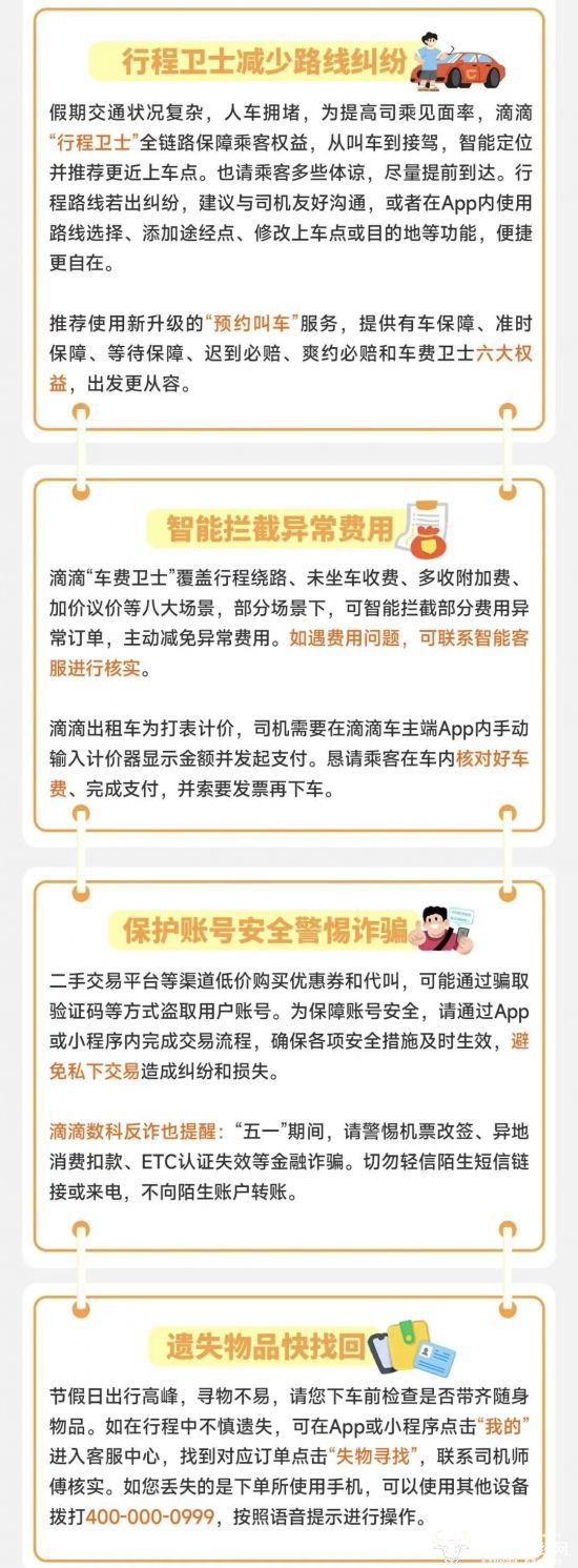 “五一”假期出行高峰,为努力保障用户出行安心畅通,在主管部门指导下,滴滴提前部署风险隐患排查、安全应急演练、司机专项培训等,并结合假期特点加固安全方案、增加技术和人力投入,确保遇到各类紧急情况时高效响应、妥善解决。