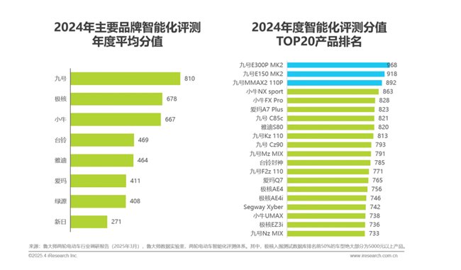 近日,艾瑞咨询重磅发布《2025年中国两轮电动车行业研究报告》。报告指出,随着新国标《电动自行车安全技术规范(GB 17761—2024)》正式落地,中国两轮电动车行业迎来技术升级与市场格局重塑的重要时刻。面对新一轮产业变革,九号公司(Segway-Ninebot)凭借卓越的技术实力和精准的市场战略,全面领跑行业,在高端化、智能化、资本表现等关键维度,均稳居行业第一。