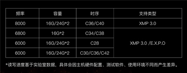 新战斧内存系列提供了不同的频率与容量组合,最高频率可达8000MT/s,用户可以根据自己的PC平台选择合适的规格。
