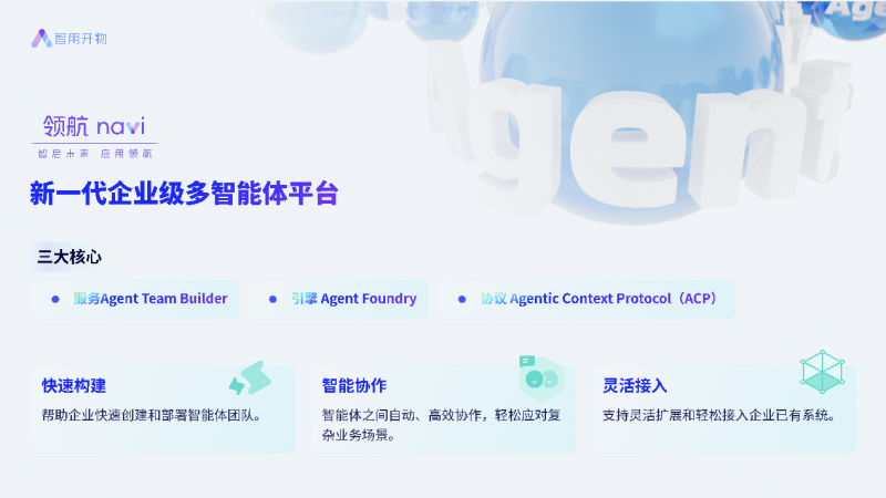 “领航navi”是智用人工智能应用研究院孵化企业「智用开物」发布的战略性产品,其具备行业覆盖更全、应用场景更多、连接范围更广、上手操作更易的特点。“领航navi”作为一款面向企业级应用的新一代多智能体平台,通过“服务+引擎+协议”三大核心模块,为企业提供智能体团队的快速构建、自动化编排与全生命周期管理能力。平台基于自主研发并经过多行业验证的AI Agent Foundry技术底座升级,支持对话式创建、智能任务调度及兼容MCP协议的ACP交互标准,满足复杂业务场景下的高效协作需求。创新引入时序卡片(TS Card)与AI Action,以直观的交互设计和主动响应机制,强化智能体对业务的理解与实时交互能力,同时支持灵活扩展与企业现有系统无缝集成,助力企业实现智能化升级与敏捷化运营。