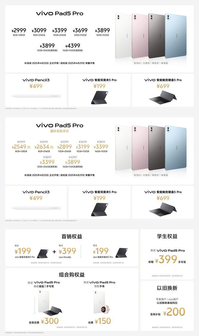 vivo Pad5 Pro 标准版(8GB+128GB)首发价 2999 元,首销期间叠加国补后低至 2549.15 元,性价比突出;超轻版(12GB+256GB)3899 元,适合对便携性要求极高的用户。配件方面,vivo Pencil3(499 元)与智能触控键盘 5 Pro(699 元)建议按需搭配,学生用户可关注教育优惠,购买平板 + 手写笔组合可享额外折扣。