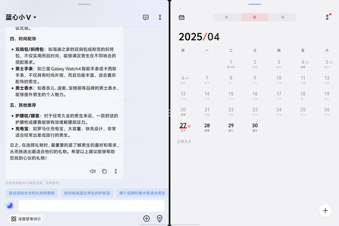 “小 V 写作” 支持改写、总结、润色等多文体处理,在原子笔记中输入关键词,即可自动生成会议纪要、新闻稿等内容,甚至可根据指定风格调整语言表达;“小 V 帮记” 具备同声传译、关键内容提醒、AI 转记功能,会议中实时将语音转为文字,并标注重点段落,会后可快速生成会议记录;“小 V 圈搜” 通过触屏圈选或语音指令,联动百科搜索与日程创建,例如圈选图片中的英文单词可即时翻译,长按地址可直接添加至日历提醒;“AI PPT 助手” 输入主题即可自动生成大纲、文案与设计模板,内置多种风格库,大幅缩短 PPT 制作时间。此外,蓝心小 V 接入 DeepSeek-R1 大模型,支持联网搜索与深度问答,复杂业务问题亦可快速获取专业解答。