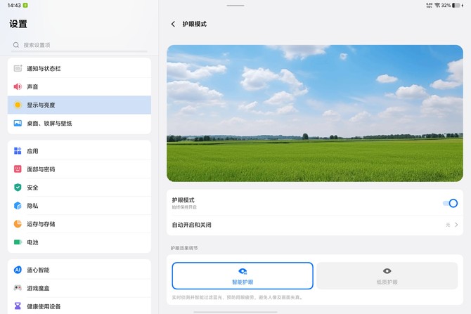 护眼方面,vivo 依托视觉健康实验室的专业积累,为 Pad5 Pro 打造了全方位护眼系统。屏幕支持 DC 调光、智能色温自适应、仿生亮度调节等 10 余项技术,可根据环境光线自动调整亮度与色温,减少蓝光刺激。同时通过莱茵硬件级低蓝光认证,从光源端降低有害蓝光输出,即便长时间办公或娱乐,眼睛也不易疲劳,尤其适合学生上网课或职场人士处理报表等高频使用场景。