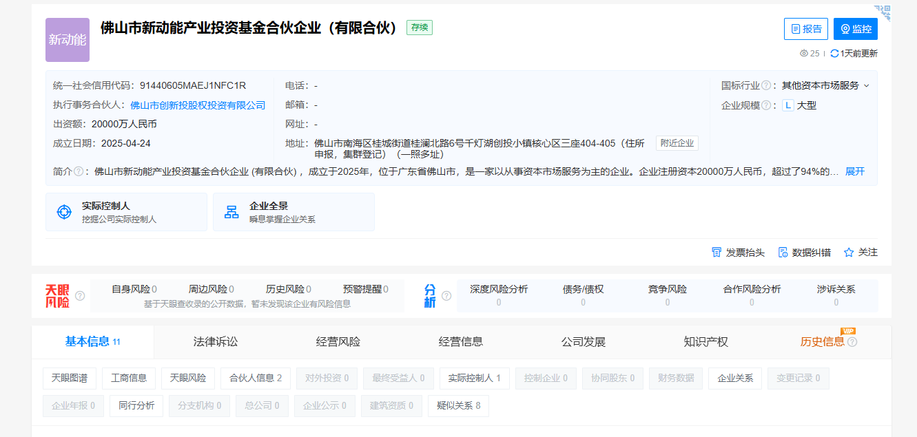 企查查信息显示,该基金由佛山市创新创业投资有限公司联合多方资本共同组建。这一架构既体现了国有资本的引导作用,又引入了市场化运作机制,形成"政府搭台、专业运营、风险共担"的创新模式。未来或将通过"基金招商"方式,吸引优质项目落户佛山,形成产业集聚效应。