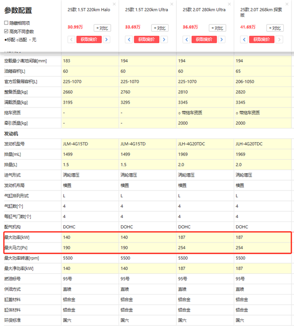 而 1.5T 的 JLM-4G15TD 则是吉利最新跟奔驰联合打造的混动发动机,也将搭载在最新的 CLA 上,所以光从发动机上来说,这个 1.5T 应该会更适合插混车的工况,2.0T 的 Ultra 版更多是为了诗和远方。
