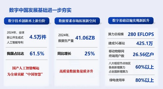 《报告》指出,在各地区各部门共同努力下,2024年数字中国建设迈出新的坚实步伐,呈现稳中提质的发展态势。据有关机构研究,近三年数字中国发展指数保持10%以上的稳步增长。数字技术创新再上新台阶,全球新公开的4.5万件生成式人工智能专利中,我国占比达61.5%。国产人工智能崛起为全球贡献“中国智慧”。数据要素市场拓展新空间,2024年数据生产量达41.06泽字节(ZB),同比增长25%,高质量数据集量质齐升。数字基础设施实现新跃升,算力总规模达到280 EFLOPS,累计建成5G基站425.1万个,移动物联网终端用户数达26.56亿户,八大枢纽节点地区各类新增算力占全国新增算力的60%以上,绿电使用率超过80%。
