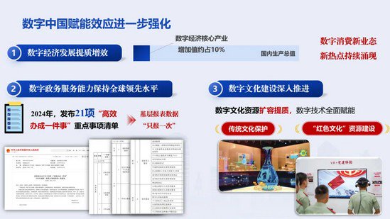 《报告》显示,数字经济发展提质增效,数字经济核心产业增加值占国内生产总值比重达10%左右,数字消费新业态新热点持续涌现。数字政务服务能力继续保持全球领先水平,2024年共发布21项“高效办成一件事”重点事项清单,扎实推进基层报表数据“只报一次”工作。数字文化建设深入推进,数字文化资源扩容提质,数字技术全面赋能传统文化保护、“红色文化”资源建设。数字社会更加普惠便捷,国家教育数字化战略取得扎实成效,远程医疗服务网络已覆盖所有市县。数字生态文明更加绿色智慧,建成全球规模最大、要素最齐全、技术手段较先进的生态环境监测网络,自然资源“一张图”和数字孪生水利建设提质提速。