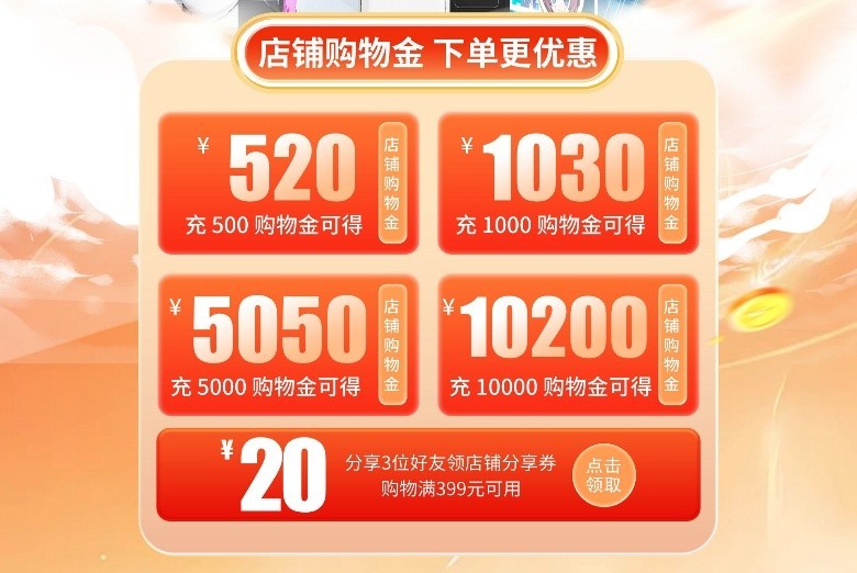 活动期间,充值店铺购物金,下单更优惠,充值500元得520元,充值1000元得1030元,充值5000元得5050元,充值10000元得10200元,此外,分享店铺还可额外获得20元的店铺分享券。
