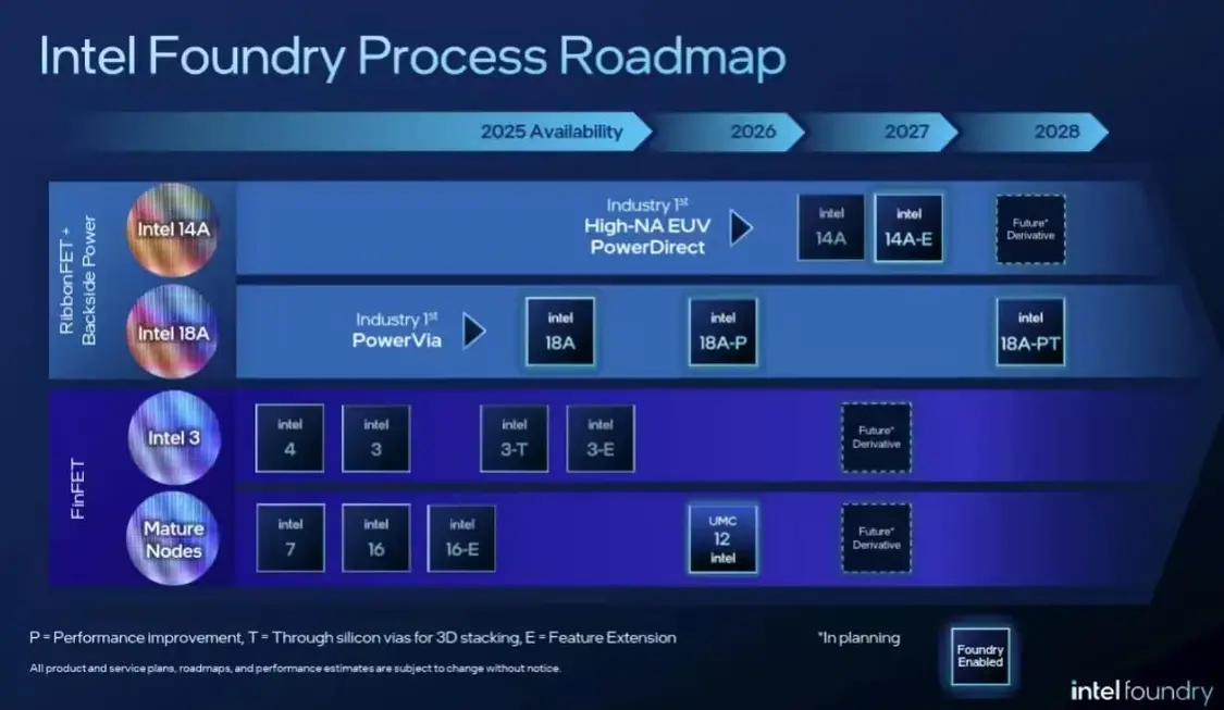 根据英特尔的官方路线图,18A-P将在2026年推出,18A-PT要等到2028年。此外,14A将在2027年到来,还会有14A-E工艺。