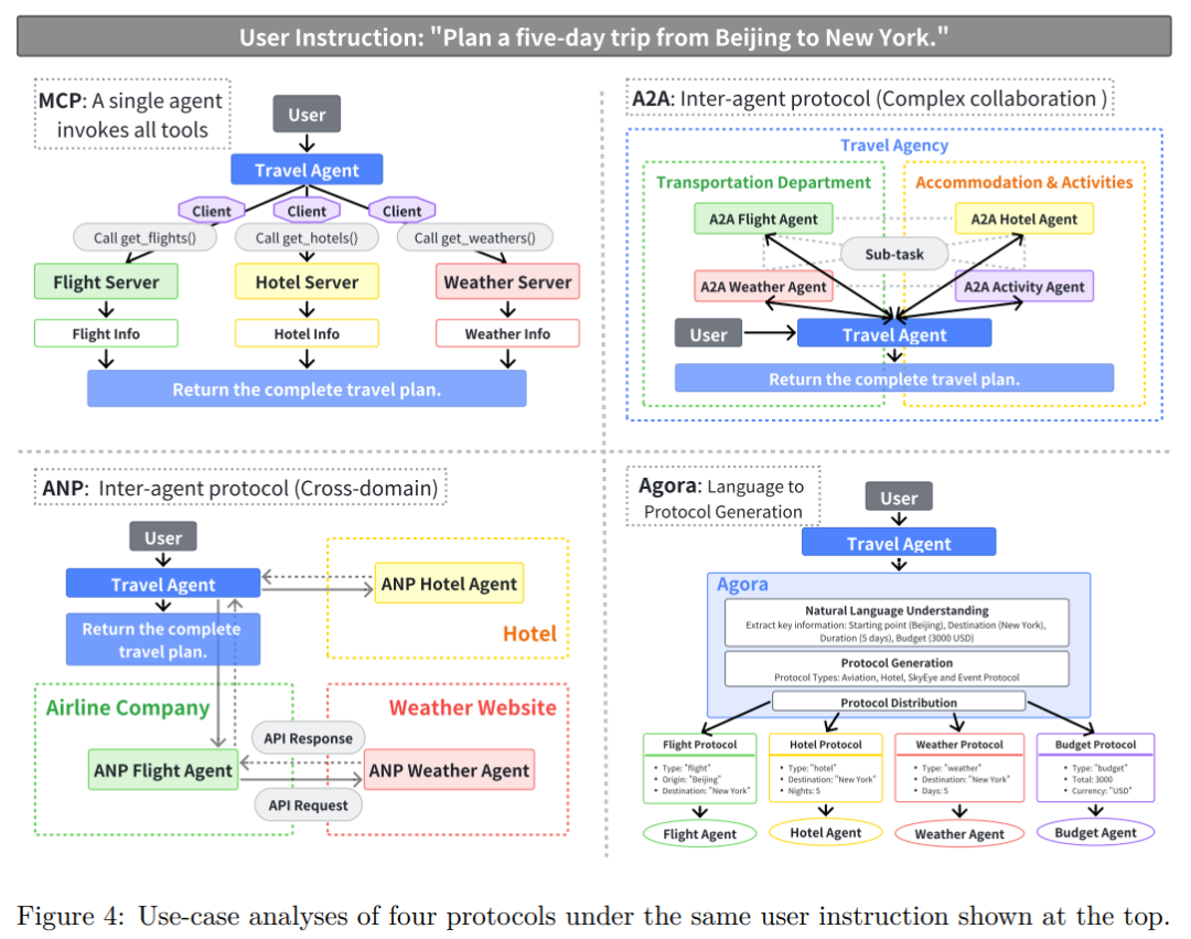 论文通过一个「策划北京到纽约的五日旅行」的真实用例,论文生动展示了四种不同协议架构的实际应用差异: