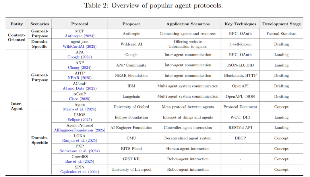 这一分类法涵盖了主流协议,包括 Anthropic 的 MCP、Google 的 A2A、ANP 社区的 ANP、NEAR 基金会的 AITP、Eclipse 基金会的 LMOS 等十余种协议。详细分类表格中,论文还对每种协议的提出者、应用场景、关键技术和开发阶段进行了全面梳理,为开发者选择合适协议提供了清晰指引。