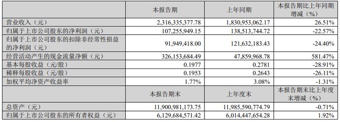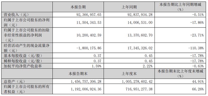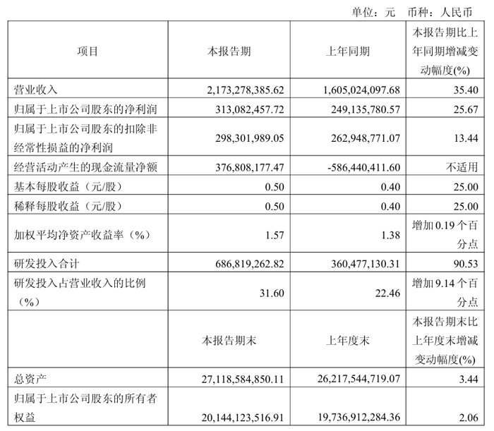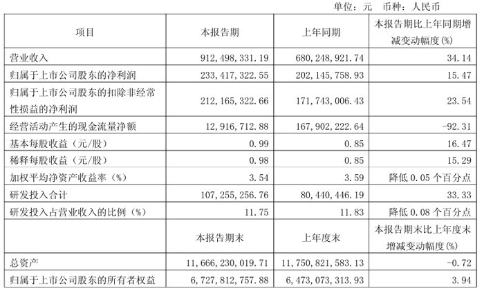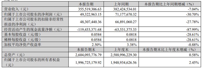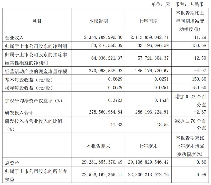 本期归属于上市公司股东的扣除非经常性损益的净利润为2.98亿元,较上年同期增加0.35亿元,同比增长13.44%,主要系公司毛利增加2.20亿元,本期研发费用增长2.50亿元,以及研发加计扣除增长导致所得税费用同比减少约0.22亿元。