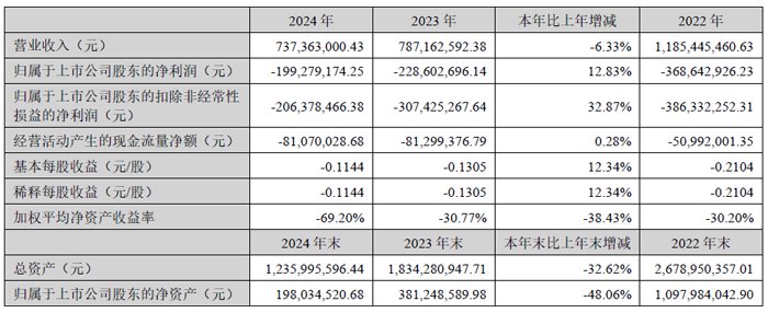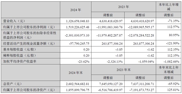 公司因实施重整,生产经营进行了结构性调整,收缩业务规模、精简人员以及严控各项费用支出,但公司于2024年11月底才正式进入重整程序,逾期债务计提利息、罚息或违约金增加,全年财务费用仍然高企,同时因诉讼事项导致部分银行账户被司法冻结,以及部分资产被冻结、查封,对公司生产和经营造成了一定影响。报告期末,公司归属于上市公司股东的扣除非经常性损益的净利润-23.01亿元,经营性现金流净额-5,779.02万元,较上年同期减少121.90%。