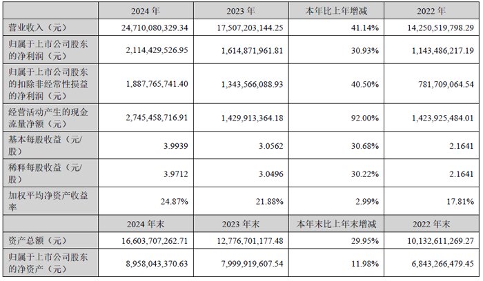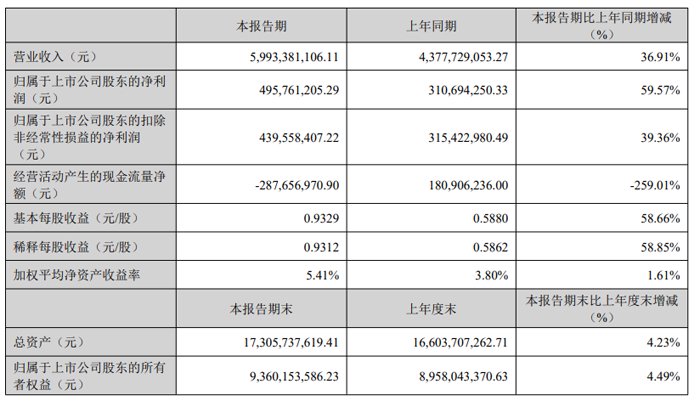 报告期内,归母净利润为15.81亿元,比上年同期增加38.80%;扣非净利润为15.70亿元,比上年同期增加44.75%;基本每股收益为2.9613元,比上年同期增加37.89%;以上主要原因是:公司营收规模持续扩大,规模效应逐渐显现,成本费用率稳定下降;