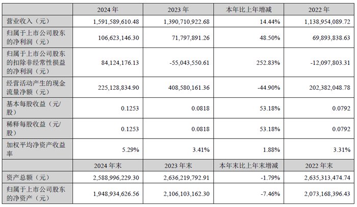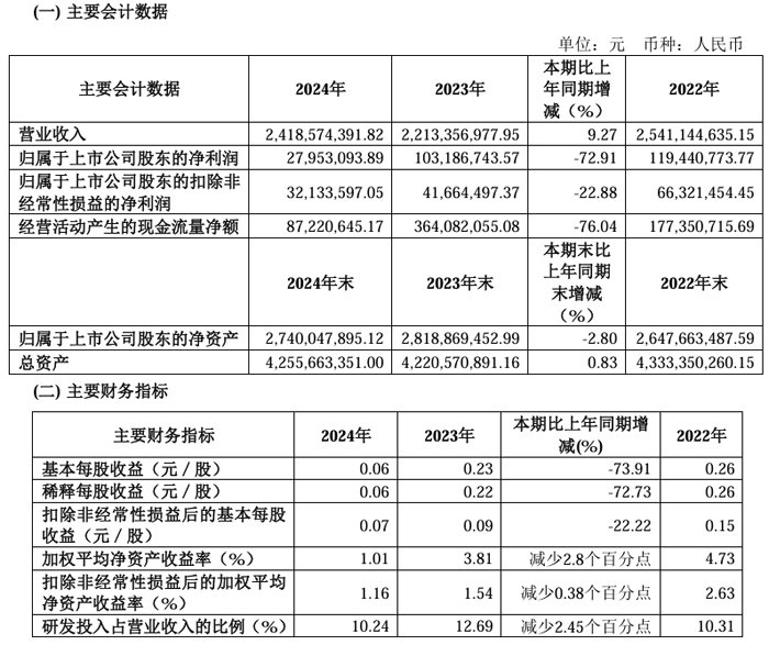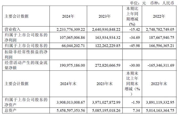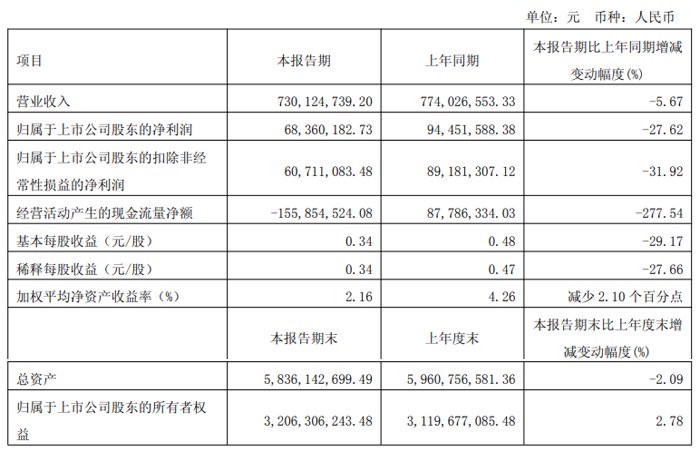 报告期末,公司总资产1,149,895.68 万元,较期初增长5.64%;归属于上市公司股东的净资产322,641.60 万元,较期初增长37.58%。总资产及净资产增长主要系本报告期收到向特定对象发行人民币普通股的增资款所致。基本每股收益、稀释每股收益、扣除非经常性损益后的基本每股收益均下降,主要系2024 年利润减少所致。