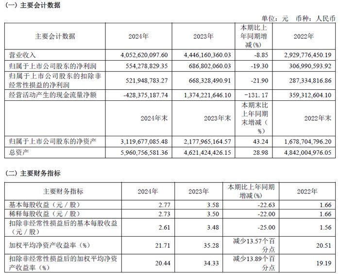 2024年度,苏州赛腾精密电子股份有限公司实现营业收入40.53亿元,同比减少8.85%;实现归母净利润5.54亿元,同比减少19.30%;实现扣非净利润52,194.88 万元,同比减少21.90%。2024年,国内外经济形势变化,公司业绩短期承压,但公司保持稳健的经营,综合毛利达42.77%。