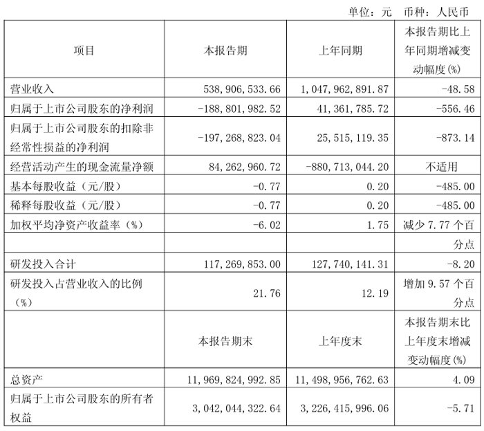 报告期内,营业总成本481.91亿元,销售费用、管理费用、研发费用、财务费用分别为4.32亿元、13.82亿元、30.14亿元、3.88亿元。利润总额亏损22.77亿元,利润总额23.48亿元,净利润19.37亿元。
