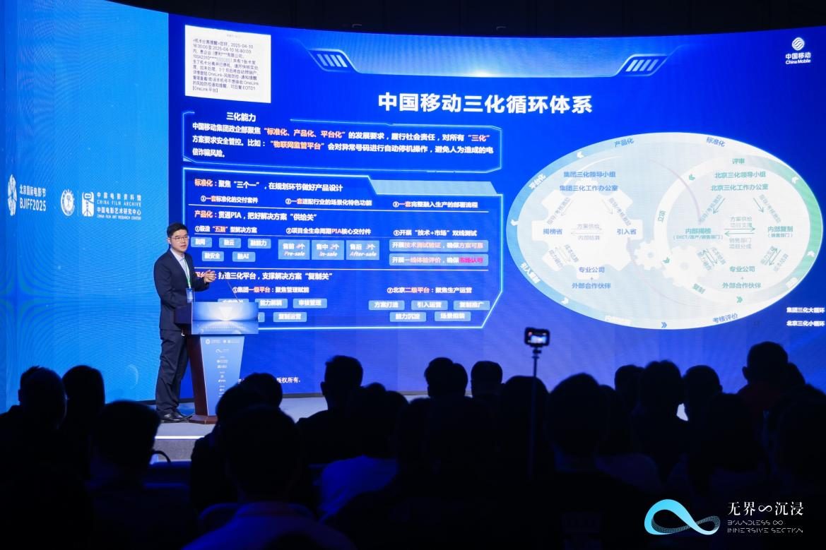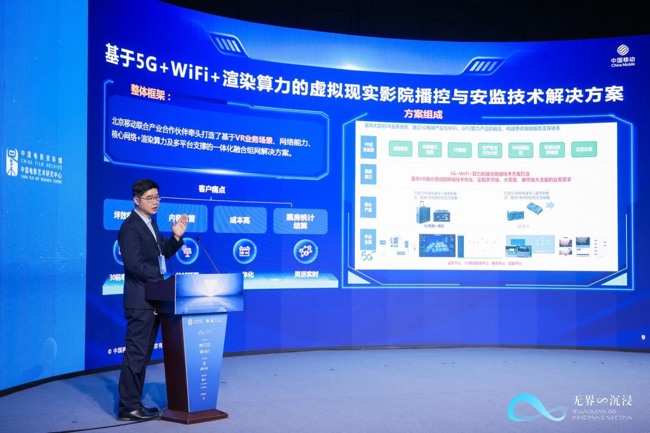 在不久的将来,人们熟悉的电影院里可能会发生一些颠覆性的变化:观众不再集体凝视一块银幕,而是可以选择戴上VR头显,跟随主人公进入电影情节——公路飙车时上下颠簸,沙漠探险时风沙扑面,甚至能在剧情场景中自由行走。这一科幻场景的背后,是中国移动北京公司(北京移动)与合作伙伴联手,于第十五届北京国际电影节上首发的“5G+WiFi+渲染算力的虚拟现实影院播控与安监技术解决方案”(简称“虚拟现实影院播控与安监方案”)。方案融合了5G专网、WiFi与渲染算力技术,以及5G核心网对关键帧数据的调度能力,成功解决了网络延迟与内容监管两大行业难题,为虚拟现实影院的大规模商业化落地提供了技术保障。