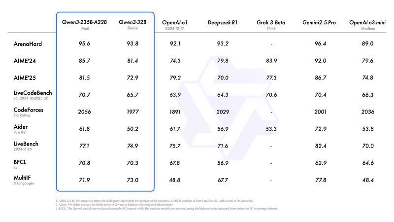 报告显示,Qwen3-235B-A22B 在代码、数学、通用能力等基准测试中,超过了与DeepSeek-R1、o1、o3-mini、Grok-3 和 Gemini-2.5-Pro 等全球顶尖模型。成为了全球最强的开源模型。