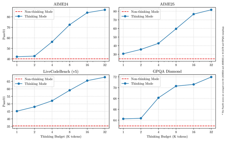 关键在于,这种快慢思考灵活切换的模式能有效的降低成本,阿里在博客中称:这两种模式的结合大大增强了模型实现稳定且高效的“思考预算”控制能力。这样的设计让用户能够更轻松地为不同任务配置特定的预算,在成本效益和推理质量之间实现更优的平衡。