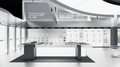 当五金构件超越功能属性,成为空间叙事的主角,inDare用建筑逻辑重塑品牌的技术美学叙事。入口处极具张力的悬挑结构,通过微妙的角度形成天然的视觉引导,将目光聚焦于中央由精密五金组件构筑的「品牌脊梁」,以空间力学直观诠释产品承载力,将产品承重性能的实体化注解。