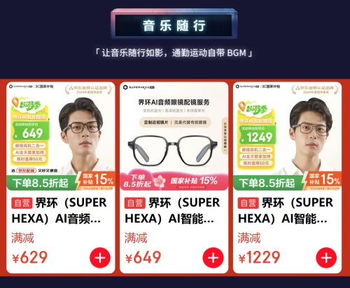 此外,消费者还可入手界环AI音频智能眼镜,售价629元,在京东下单可享国家补贴15%优惠,拥有翻译、听歌、AI畅聊等多种实用功能,续航方面,眼镜在60%音量条件下,能11小时连续听歌不断电。