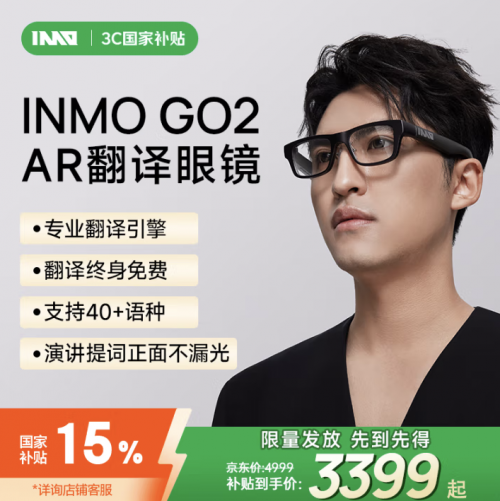 频繁海外出差需要翻译助手,可以入手INMO GO2 AR翻译智能眼镜,在京东叠加国家补贴后到手价低至3399元起,这款智能眼镜可适应全球网络,覆盖40种语言,在哪里都能快速翻译,且可脱离手机独自使用。此外,京东还将在5月10日正式上线INMO AIR3 AR智能眼镜新品并开启预售,想要下单新品的消费者可持续关注。