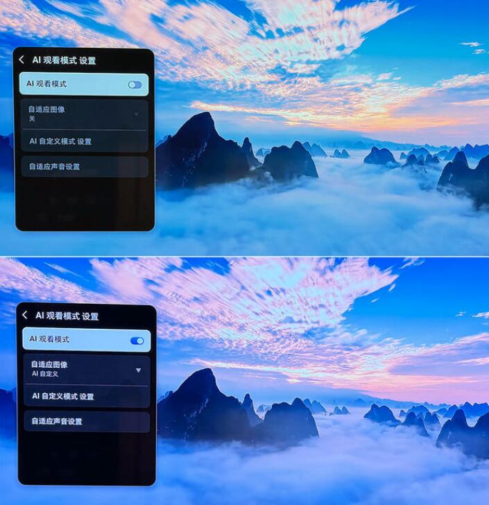 我们通过实际对比,来看看AI观看模式下同一场景的不同表现。如上图所示,当开启了AI观看模式后,画面色彩变得更加的丰富,夕阳下天空云彩泛着淡粉色,云层的层次也变得更加明显,天空更加的蔚蓝,比未开启AI观看模式的画质更加的逼近真实场景。